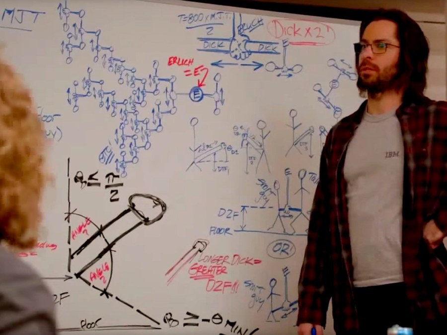 The funniest episode, ‘Optimal Tip to Tip Efficiency‘ (Emmy nominated, folks!), features a scene where our heroes are presenting their product at a technology competition. As they prepare for their slot, it’s not looking hopeful. One of the guys attempts to motivate the team with the declaration that they’re going to win even if he has to pleasure every member of the audience. What follows is a scene of problem-solving genius as they attempt to do the math on how long this would actually take him and if he could manage to complete his task during the presentation.