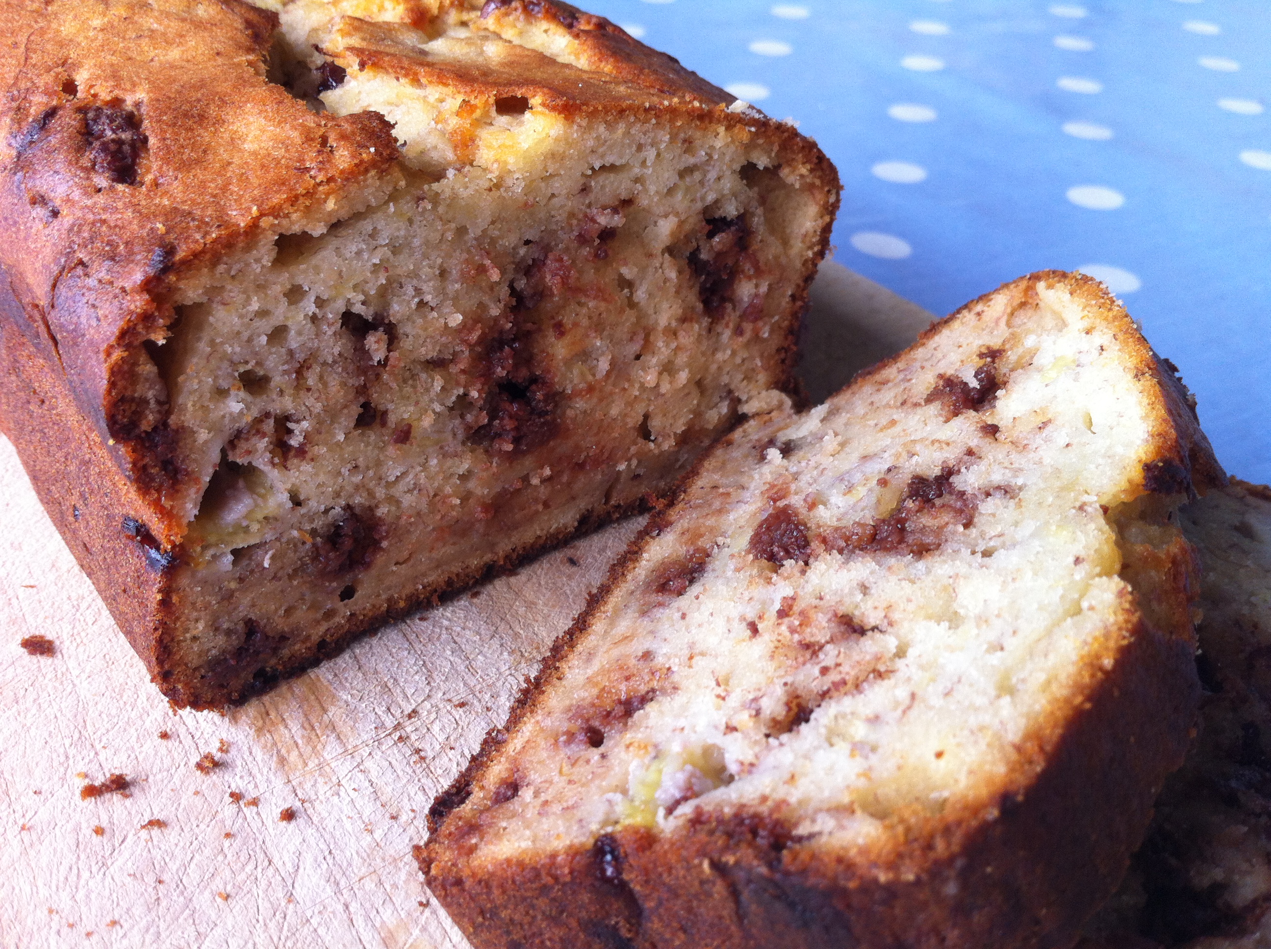 I’m back into baking in a big way at the moment. We had a Birthday Party for my daughter last week which needed a chocolate muffin birthday cake, an ice-cream cake, cheesy nibbles, lots of cupcakes for decorating and this loaf. I love this recipe because it’s incredibly tasty and moist, quick and easy (not even any creaming of butter and sugar required), and because I can kid myself it’s healthy enough to have a slice for breakfast. It also works well even if you don’t have all the ingredients; I’ve made with without eggs (just added another banana), without butter (added oil instead) and with plain flour (chuck in an extra tsp of baking powder). Sometimes I add a tsp of vanilla, this time I added a tbsp of Starbuck’s caramel syrup just because it was on the worktop. Either way, this cake always tastes delicious!